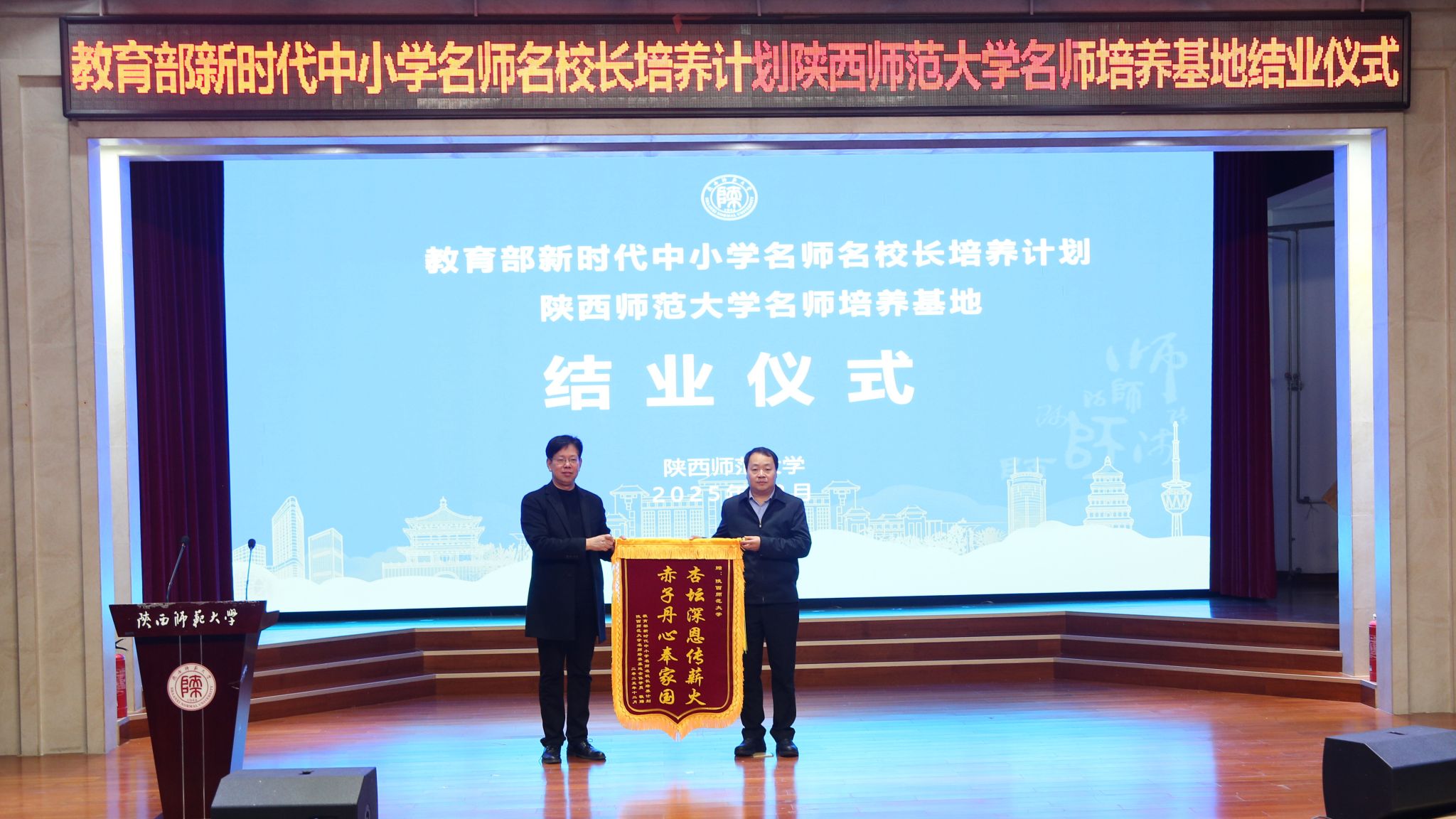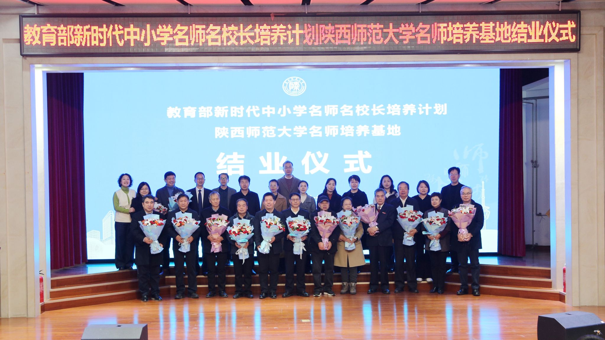 培养基地名师结业名单》。文学院等六家培养学院依次为学员颁发结业证书。学员代表向王云博副校长赠送“杏坛深恩传薪火,赤子丹心奉家国”锦旗,并向15位与会导师代表献花,以表诚挚谢意。